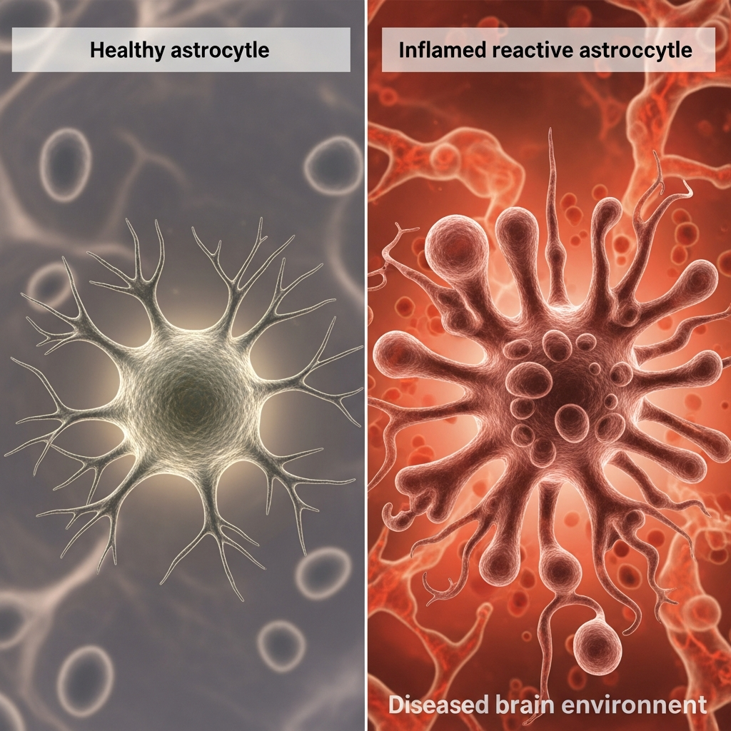 Imagine the brain as a high-tech factory. Astrocytes are the maintenance crew. Toxic protein clusters trigger a false alarm, and the crew panics, damaging machinery. This is reactive astrogliosis.